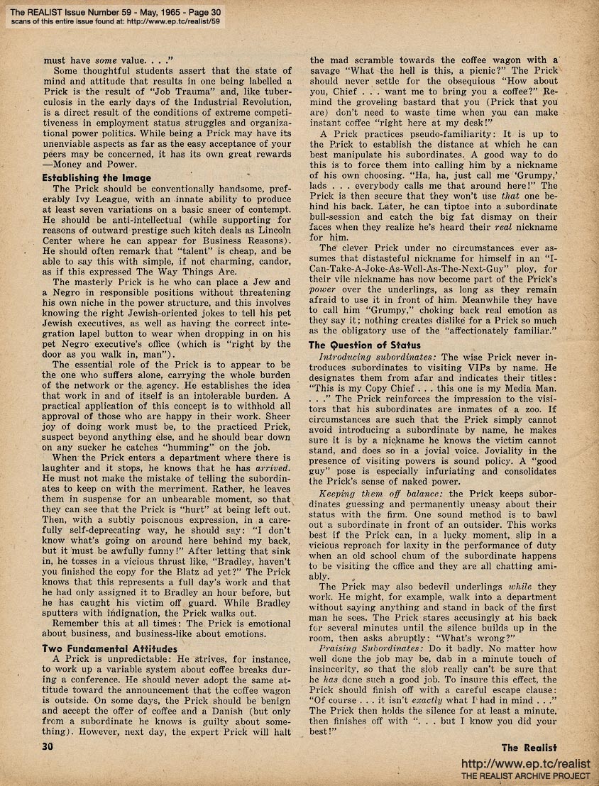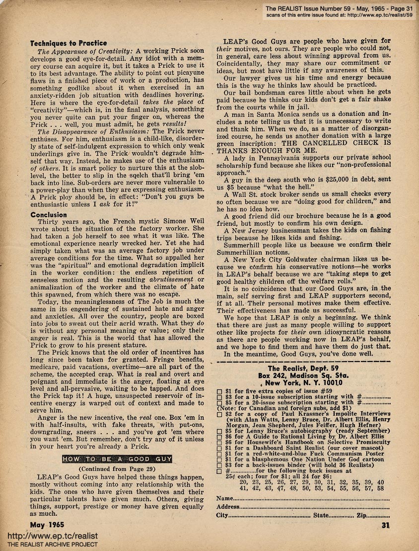 MAY 1965 CONTENTS: Page 01: COMIC BOOK ESCALATION OF AMERICA'S WAR ON VIETNAM and YOU DON'T HAVE TO BE JEWISH TO LOVE LEROI JONES -- Page 02: An Exegetical Study of the New Tom the Word Wolfe's STYL by Barbara Long -- Page 03: EDITORIAL GIGGIES -- Page 04: NO, VIRGINIA by Alan Whitney -- Page 05: FOOTNOTES OF A MARCHER by Rev. James R. McGraw -- Page 06 -- Page 07 -- Page 08 -- Page 09: A LETTER FROM JOSEPH HELLER -- Page 10 -- Page 11: "We Don't Want to Marry Your Sister" by Bill Murphy -- Page 12: CO-EXISTING by Saul Heller -- Page 13 -- Page 14 -- Page 15: CROTTES DE LICORNE by Harold Feldman -- Page 16: The ADVENTURES of SUPERIORMAN! by Bloom/Leonard -- Page 17 -- Page 18 -- Page 19 -- Page 20: ED FISHER'S (HALF) PAGE -- Page 21: SIR REALIST (letters) -- Page 22 -- Page 23 -- Page 24 -- Page 25: PRESS DISTORTION OF THE FREE SPEECH MOVEMENT by Michael Nagler and by Floyd Hunter -- Page 26 -- Page 27 -- Page 28: WHY I DID IT - or, Happiness is a 4-letter word by John J. Thomson -- Page 29: ONCE AGAIN THE REALIST PRESENTS BOTH SIDES OF A QUESTION by Larry Cole: Altruistic Function and Effectiveness or -- How to Be a Good Guy and by John Francis Putnam: Managerial Function and Effectiveness or -- How to Be a Prick -- Page 30 -- Page 31 -- Back Cover: MALICE IN WONDERLAND by Madalyn E. Murray and DRAFTLESS IN UTOPIA by Robert Wolf
