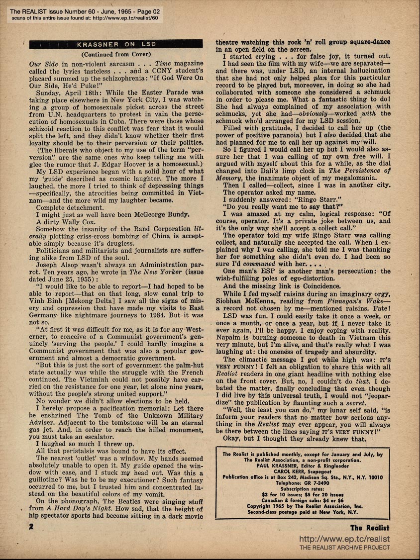 You are reading issue No. 60 - Including Paul Krassner's First LSD Trip and Dick Guindon's "Old Dad, Poor Dad, We've Hung You in the Closet and I'm Feeling So Sad" - June 1965