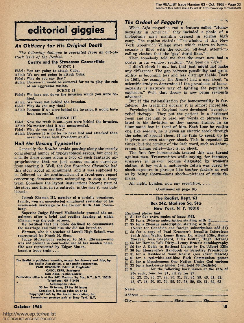 OCTOBER 1965 CONTENTS: Page 01: A LITTLE PLAY BY JULES FEIFFER -- Page 02: SIR REALIST (letters) -- Page 03: EDITORIAL GIGGIES - An Obituary for His Original Death - Hail the Unsung Typesetter - The Ordeal of Faggotry -- Page 04: THE VILLAGE SQUIRE by Paul Krassner -- Page 05: THE LONELY PRIVATE WORLD OF DIRTY MOVIES by Michael Valenti -- Page 06 -- Page 07: BIGGER THAN CHICKEN SOUP by Avery Corman -- Page 08: LENNY BRUCE DEFENDS -- Page 09: AT PLM, PROGRESS IS NOT THEIR MOST IMPORTANT TARGET (A response to Larry Cole by Ed Lemansky of the Progressive Labor Movement) -- Page 10: THE SINGING INQUISITOR by Harold Feldman and THE HOSTILE NOVELIST by Robert Lasson -- Page 11: COME ALIVE! YOU'RE IN THE POPSICLE GENERATION by Dick Guindon -- Page 12 -- Page 13 -- Page 14 -- Page 15: LET THERE BE LIFE by S.L. Stebel and LET THERE BE DEATH by Arne Passman -- Page 16: THE BENEFIT OF THE SHROUD and The UnFree NonUninversity - Ah Sordid Announcements -- Page 17: CO-EXISTING by Saul Heller -- Page 18 -- Page 19: ED FISHER'S PAGE -- Page 20: THE ETHNIC JOKE AS A BAROMETER OF CLASS DISTINCTION and BETTER DEAD THAN RED -- Page 21 -- Page 22: IT'S ALL RELATIVE by Gene Feehan -- Page 23: NO, VIRGINIA by Alan Whitney -- Back Cover: A VIOLENT PEACE MOVEMENT by Don Waskey and SOFT-CORE PORNOGRAPHY OF THE MONTH: Going-Limp-While-Being-Carried-Away-By-Police-At-Protest-Demonstration Cheesecake Department (upskirt)