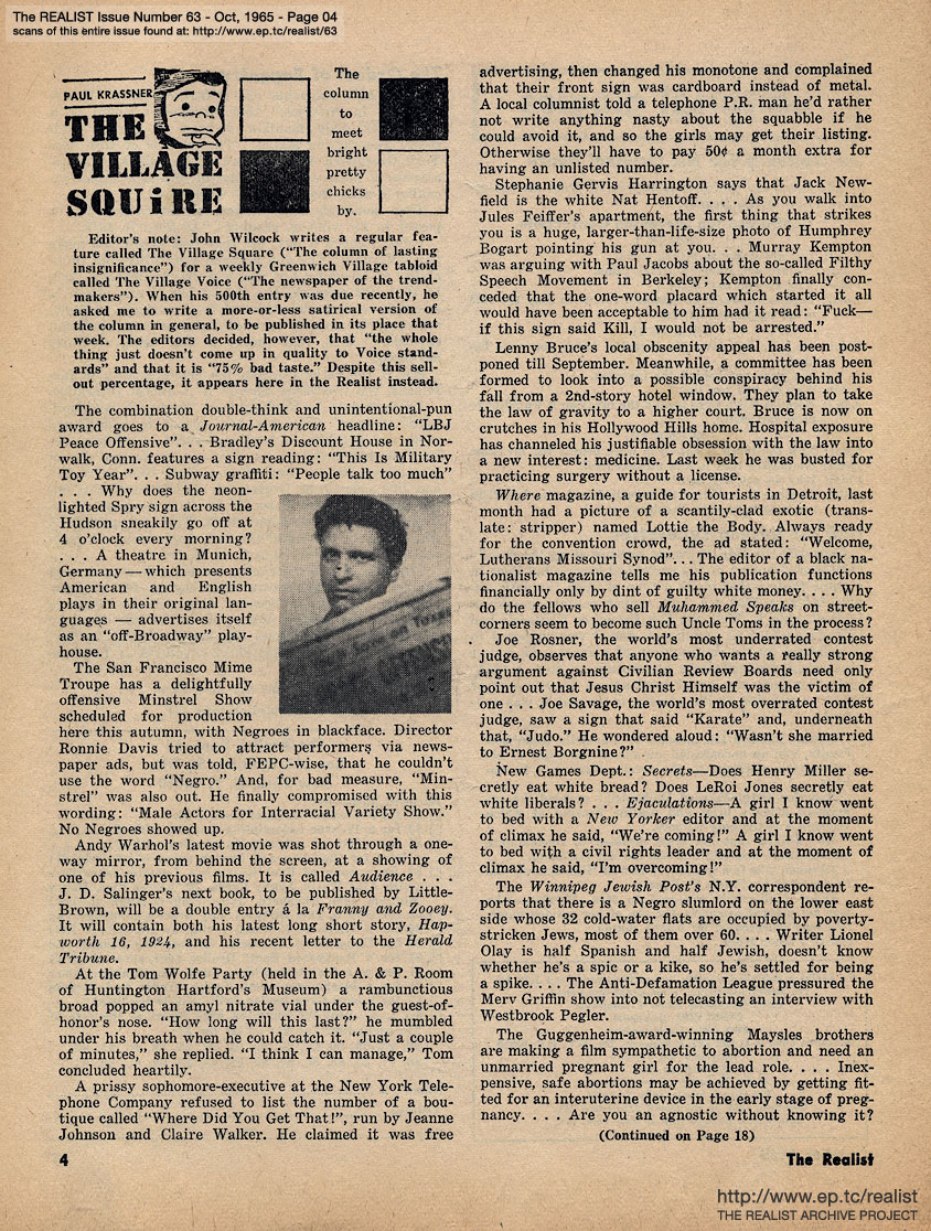OCTOBER 1965 CONTENTS: Page 01: A LITTLE PLAY BY JULES FEIFFER -- Page 02: SIR REALIST (letters) -- Page 03: EDITORIAL GIGGIES - An Obituary for His Original Death - Hail the Unsung Typesetter - The Ordeal of Faggotry -- Page 04: THE VILLAGE SQUIRE by Paul Krassner -- Page 05: THE LONELY PRIVATE WORLD OF DIRTY MOVIES by Michael Valenti -- Page 06 -- Page 07: BIGGER THAN CHICKEN SOUP by Avery Corman -- Page 08: LENNY BRUCE DEFENDS -- Page 09: AT PLM, PROGRESS IS NOT THEIR MOST IMPORTANT TARGET (A response to Larry Cole by Ed Lemansky of the Progressive Labor Movement) -- Page 10: THE SINGING INQUISITOR by Harold Feldman and THE HOSTILE NOVELIST by Robert Lasson -- Page 11: COME ALIVE! YOU'RE IN THE POPSICLE GENERATION by Dick Guindon -- Page 12 -- Page 13 -- Page 14 -- Page 15: LET THERE BE LIFE by S.L. Stebel and LET THERE BE DEATH by Arne Passman -- Page 16: THE BENEFIT OF THE SHROUD and The UnFree NonUninversity - Ah Sordid Announcements -- Page 17: CO-EXISTING by Saul Heller -- Page 18 -- Page 19: ED FISHER'S PAGE -- Page 20: THE ETHNIC JOKE AS A BAROMETER OF CLASS DISTINCTION and BETTER DEAD THAN RED -- Page 21 -- Page 22: IT'S ALL RELATIVE by Gene Feehan -- Page 23: NO, VIRGINIA by Alan Whitney -- Back Cover: A VIOLENT PEACE MOVEMENT by Don Waskey and SOFT-CORE PORNOGRAPHY OF THE MONTH: Going-Limp-While-Being-Carried-Away-By-Police-At-Protest-Demonstration Cheesecake Department (upskirt)