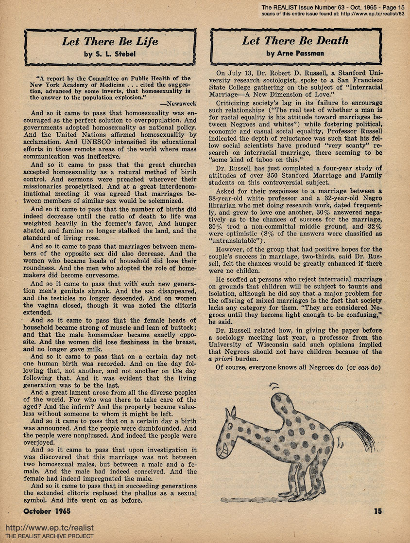 OCTOBER 1965 CONTENTS: Page 01: A LITTLE PLAY BY JULES FEIFFER -- Page 02: SIR REALIST (letters) -- Page 03: EDITORIAL GIGGIES - An Obituary for His Original Death - Hail the Unsung Typesetter - The Ordeal of Faggotry -- Page 04: THE VILLAGE SQUIRE by Paul Krassner -- Page 05: THE LONELY PRIVATE WORLD OF DIRTY MOVIES by Michael Valenti -- Page 06 -- Page 07: BIGGER THAN CHICKEN SOUP by Avery Corman -- Page 08: LENNY BRUCE DEFENDS -- Page 09: AT PLM, PROGRESS IS NOT THEIR MOST IMPORTANT TARGET (A response to Larry Cole by Ed Lemansky of the Progressive Labor Movement) -- Page 10: THE SINGING INQUISITOR by Harold Feldman and THE HOSTILE NOVELIST by Robert Lasson -- Page 11: COME ALIVE! YOU'RE IN THE POPSICLE GENERATION by Dick Guindon -- Page 12 -- Page 13 -- Page 14 -- Page 15: LET THERE BE LIFE by S.L. Stebel and LET THERE BE DEATH by Arne Passman -- Page 16: THE BENEFIT OF THE SHROUD and The UnFree NonUninversity - Ah Sordid Announcements -- Page 17: CO-EXISTING by Saul Heller -- Page 18 -- Page 19: ED FISHER'S PAGE -- Page 20: THE ETHNIC JOKE AS A BAROMETER OF CLASS DISTINCTION and BETTER DEAD THAN RED -- Page 21 -- Page 22: IT'S ALL RELATIVE by Gene Feehan -- Page 23: NO, VIRGINIA by Alan Whitney -- Back Cover: A VIOLENT PEACE MOVEMENT by Don Waskey and SOFT-CORE PORNOGRAPHY OF THE MONTH: Going-Limp-While-Being-Carried-Away-By-Police-At-Protest-Demonstration Cheesecake Department (upskirt)