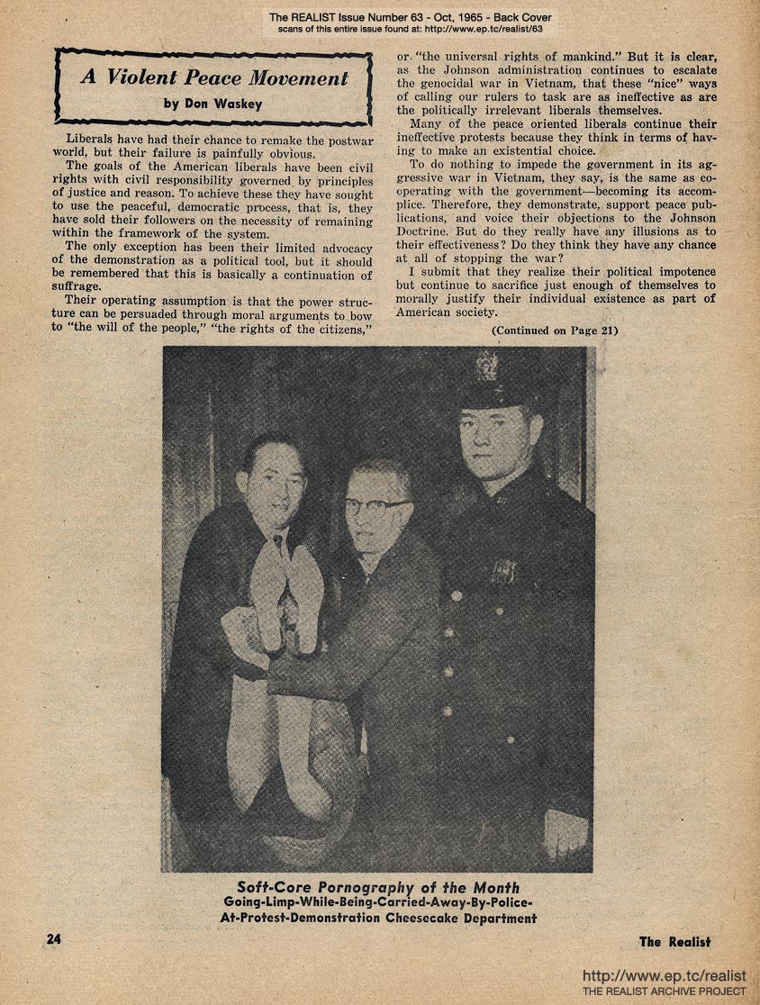 OCTOBER 1965 CONTENTS: Page 01: A LITTLE PLAY BY JULES FEIFFER -- Page 02: SIR REALIST (letters) -- Page 03: EDITORIAL GIGGIES - An Obituary for His Original Death - Hail the Unsung Typesetter - The Ordeal of Faggotry -- Page 04: THE VILLAGE SQUIRE by Paul Krassner -- Page 05: THE LONELY PRIVATE WORLD OF DIRTY MOVIES by Michael Valenti -- Page 06 -- Page 07: BIGGER THAN CHICKEN SOUP by Avery Corman -- Page 08: LENNY BRUCE DEFENDS -- Page 09: AT PLM, PROGRESS IS NOT THEIR MOST IMPORTANT TARGET (A response to Larry Cole by Ed Lemansky of the Progressive Labor Movement) -- Page 10: THE SINGING INQUISITOR by Harold Feldman and THE HOSTILE NOVELIST by Robert Lasson -- Page 11: COME ALIVE! YOU'RE IN THE POPSICLE GENERATION by Dick Guindon -- Page 12 -- Page 13 -- Page 14 -- Page 15: LET THERE BE LIFE by S.L. Stebel and LET THERE BE DEATH by Arne Passman -- Page 16: THE BENEFIT OF THE SHROUD and The UnFree NonUninversity - Ah Sordid Announcements -- Page 17: CO-EXISTING by Saul Heller -- Page 18 -- Page 19: ED FISHER'S PAGE -- Page 20: THE ETHNIC JOKE AS A BAROMETER OF CLASS DISTINCTION and BETTER DEAD THAN RED -- Page 21 -- Page 22: IT'S ALL RELATIVE by Gene Feehan -- Page 23: NO, VIRGINIA by Alan Whitney -- Back Cover: A VIOLENT PEACE MOVEMENT by Don Waskey and SOFT-CORE PORNOGRAPHY OF THE MONTH: Going-Limp-While-Being-Carried-Away-By-Police-At-Protest-Demonstration Cheesecake Department (upskirt)