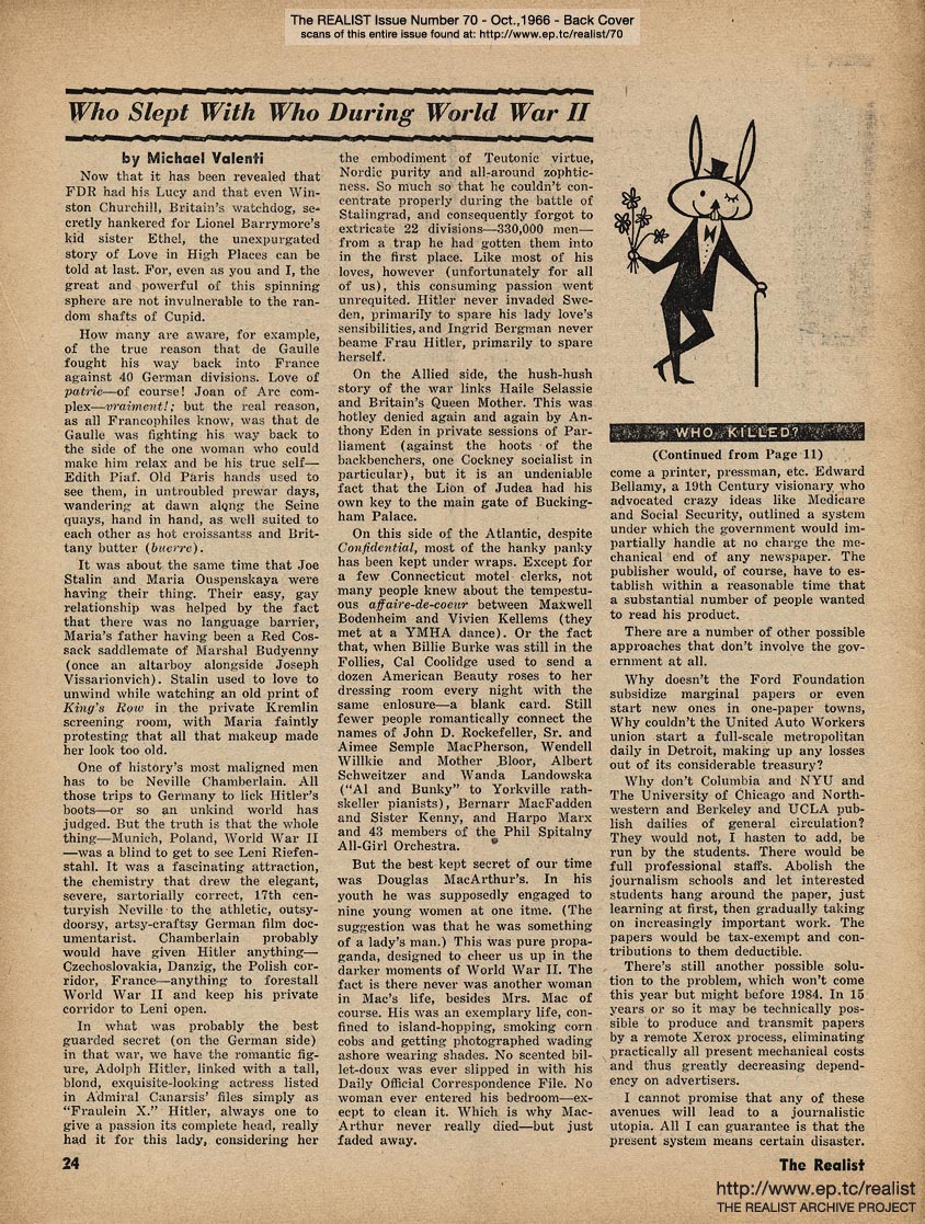 OCTOBER 1966 CONTENTS: Page 01: BIRTH CONTROL FOR THE POOR by Gerry Nadel and THE WEDDING NIGHT SPECIAL by Tad Richards -- Page 02: CO-EXISTING by Saul Heller - Beastly Suicides - Benefits of Pollution - And Now—People Food for Dogs -- Page 03: Musical Links to Crime - Truth and Consequences in Packaging -- Page 04: The Perils of Being Annoyed - Sex in the Dark -- Page 05: BROWN RICE, YELLOW JOURNALISM & A PINCH OF RED BAITING by Mike Gershman, Charles Simon and Robert Christgau -- Page 06 -- Page 07 -- Page 08 -- Page 09 -- Page 10: WHO KILLED THE HERALD TRIBUNE? by Alan Whitney -- Page 11 -- Page 12 and 13: RAKE UP ALL THE JUNK AND BURN IT AND WHAT DO YOU GET? by Dick Guindon -- Page 14 -- Page 15 -- Page 16 -- Page 17: A VISION OF ST. LUCI'S DAY by Walter R. Keller -- Page 18 -- Page 19 -- Page 20 -- Page 21 -- Page 22 -- Page 23 -- Back Cover: WHO SLEPT WITH WHO DURING WORLD WAR II by Michael Valenti