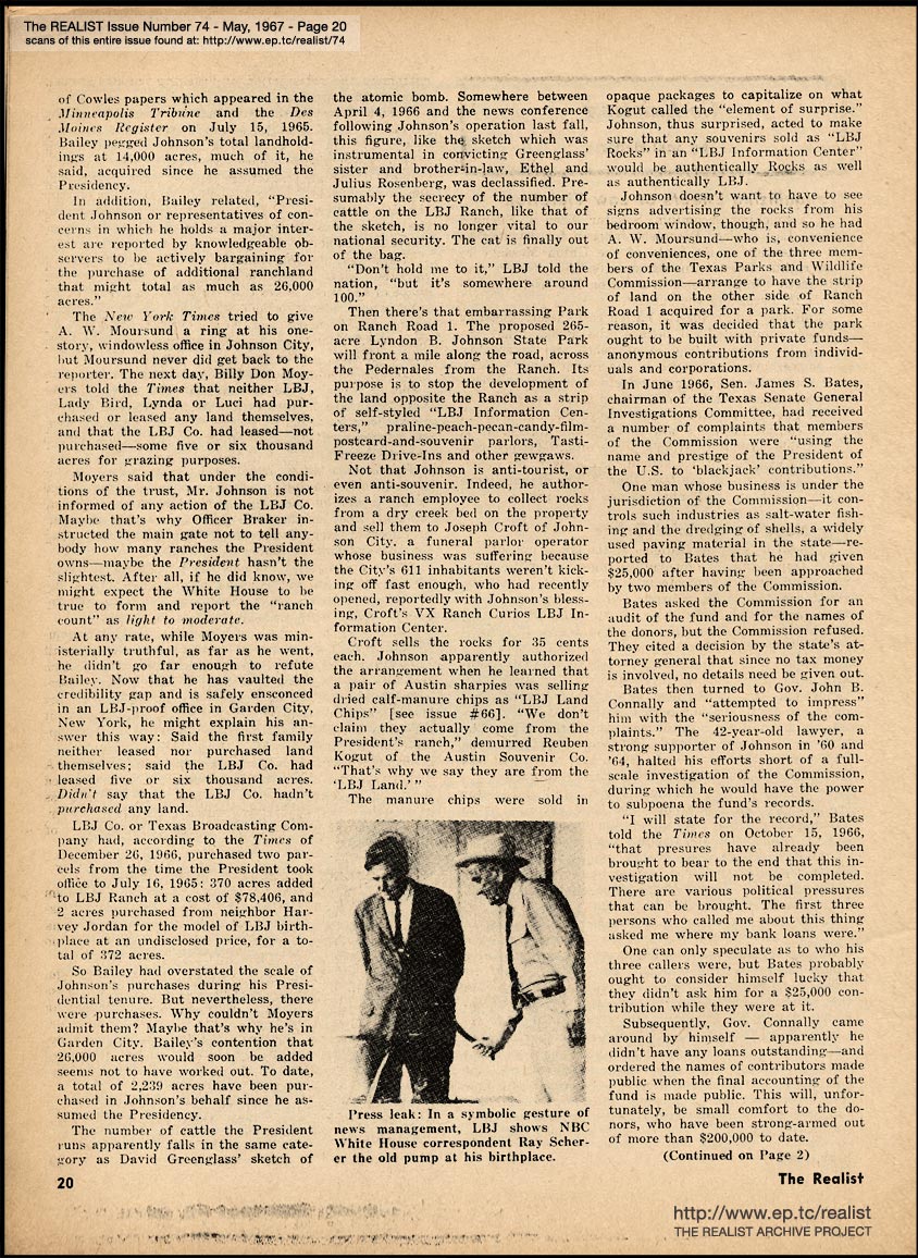 MAY 1967 CONTENTS: Page 01: THE PARTS THAT WERE LEFT OUT OF THE KENNEDY BOOK by Paul Krassner -- Page 02: SIR REALIST (Letters) -- Page 03: EDITORIAL GIGGLES -- Page 04 -- Page 05 -- Page 06 -- Page 07: ED FISHER'S PAGE -- Page 08 -- Page 09 -- Page 10 -- Page 11: MODEST PROPOSALS by John Francis Putnam -- Page 12 and 13: The DISNEYLAND MEMORIAL ORGY by Paul Krassner and Wally Wood -- Page 14: ADVICE TO THE VETERAN-LORN by Marvin Kitman -- Page 15: SOFT-CORE PORNOGRAPHY OF THE MONTH -- Page 16: REPORTER AT SMALL by Robert Wolf -- Page 17 -- Page 18 -- Page 19: HEY, HEY, LBJ -- HOW MANY CATTLE DID YOU RUN TODAY? by Craig Karpel -- Page 20 -- Page 21 CO-EXISTING by Saul Heller -- Page 22 -- Page 23: NO, VIRGINIA by Alan Whitney -- BACK COVER: THE CYNIC ROUTE FROM CRAZY SANE to LOVING HAIGHT -- or, WALT DISNEY IS ALIVE IN DISNEYLAND by Paul Krassner (continues on Page Four)