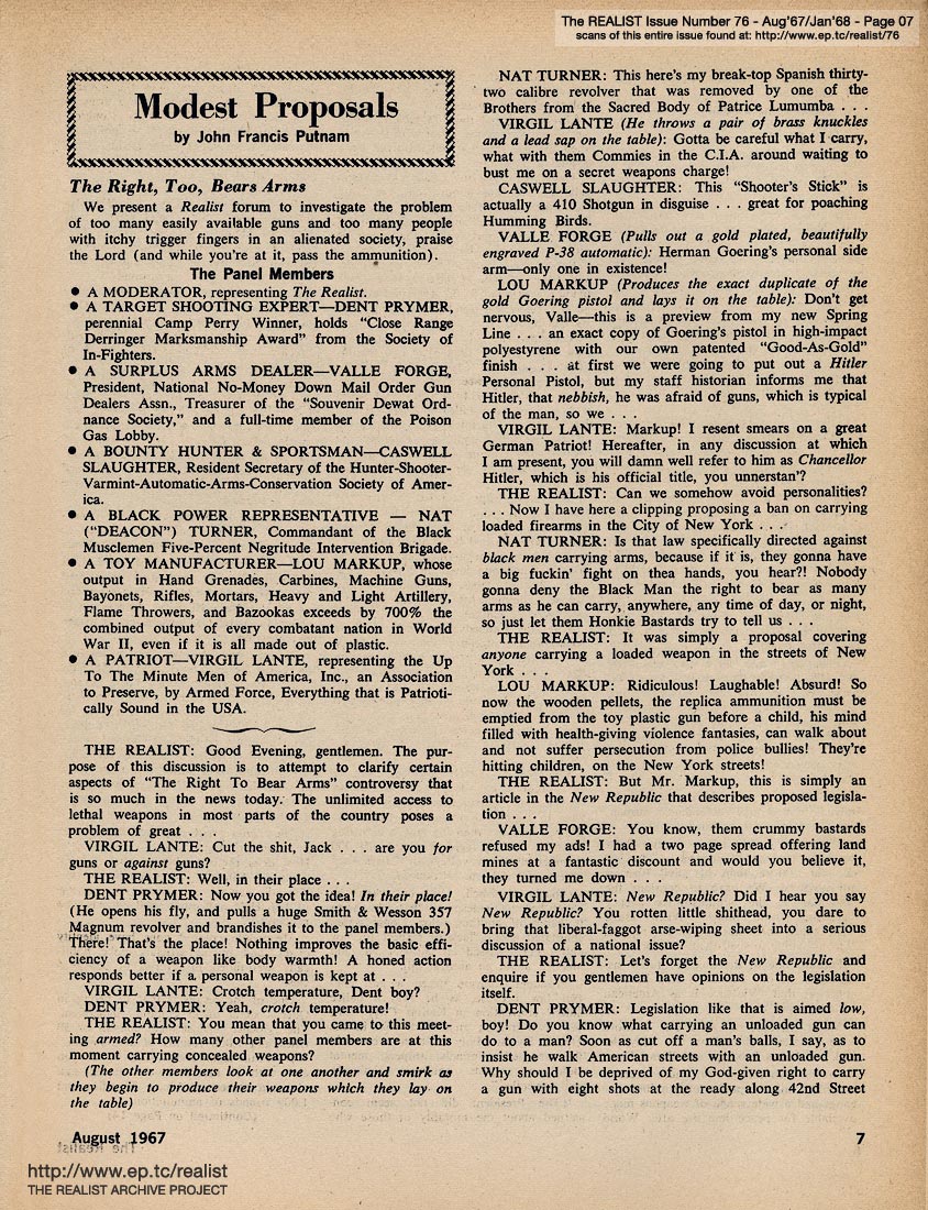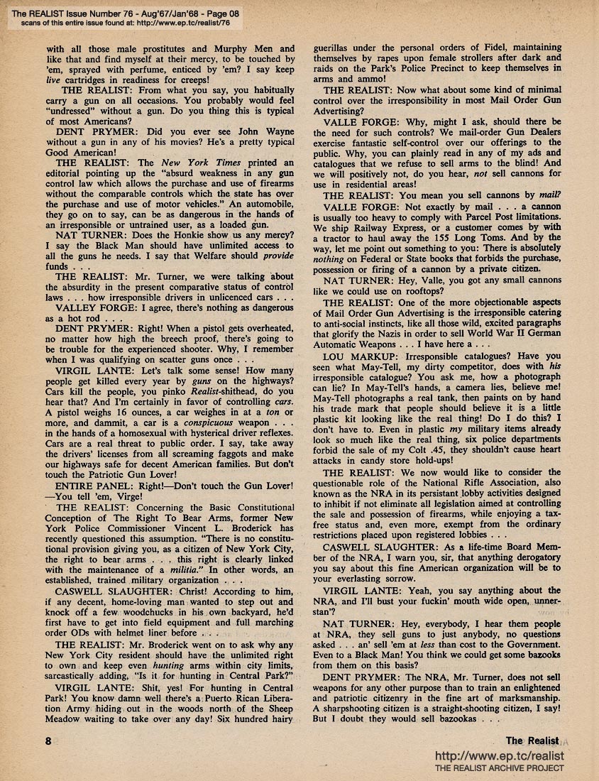 AUGUST '67 / JANUARY '68 CONTENTS: Page 01: SPIRIT OF '69 by Dick Guindon -- Page 02: EDITORIAL GIGGIES -- Page 03 -- Page 04: BONNIE AND CLYDE IN BLACKFACE by Sandra Adickes -- Page 05: NAIVE NEEDLEWORD -- Page 06 -- Page 07: MODEST PROPOSALS by John Francis Putnam -- Page 08 -- Page 09 -- Page 10: Sex Questionairre -- Page 11: HOW FAKED FAGGOTRY CAN LEAD TO YOUR HONORABLE DISCHARGE by Name Withheld -- Page 12 -- Page 13: SOFT-CORE PORNOGRAPHY OF THE MONTH - GRAND OLD PARTY HAS JOINT SESSION WITH YOUNG REPUBLICAN and REPORTER AT SMALL by Robert Wolf -- Page 14: SIR REALIST -- Page 15: REVOLUTION FOR THE HELL OF IT - How I Lost the War by Abbie Hoffman and Reason, Let Us Come Together by Paul Krassner -- Page 16 -- Page 17 -- Page 18 -- Page 19 -- Page 20 -- Page 21: ED FISHER'S PAGE -- Page 22 -- Page 23 -- Page 24: ADAM CLAYTON POWELL in DODD IS MY CO-PIRATE |
