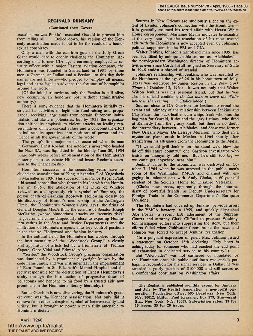 APRIL 1968 CONTENTS: Page 01: FINAL SOLUTIONS TO THE ASSASSINATION QUESTION by Craig Karpel, and by Reginald Dunsany, and by Steve Klinger -- Page 02 -- Page 03 -- Page 04 -- Page 05 -- Page 06 -- Page 07 -- Page 08 -- Page 09: ED FISHER'S PAGE -- Page 10 -- Page 11: A CASE OF ANTI-SEMITISM by Michael Valenti -- Page 12 -- Page 13 -- Page 14: IBM MAKES SURE FREEDOM DOESN'T BECOME LICENSE -- Page 15 -- Back Cover: SOME OF MY BEST FRIENDS ARE NECROPHILIACS by Eric Norden and by Renfreu Neff