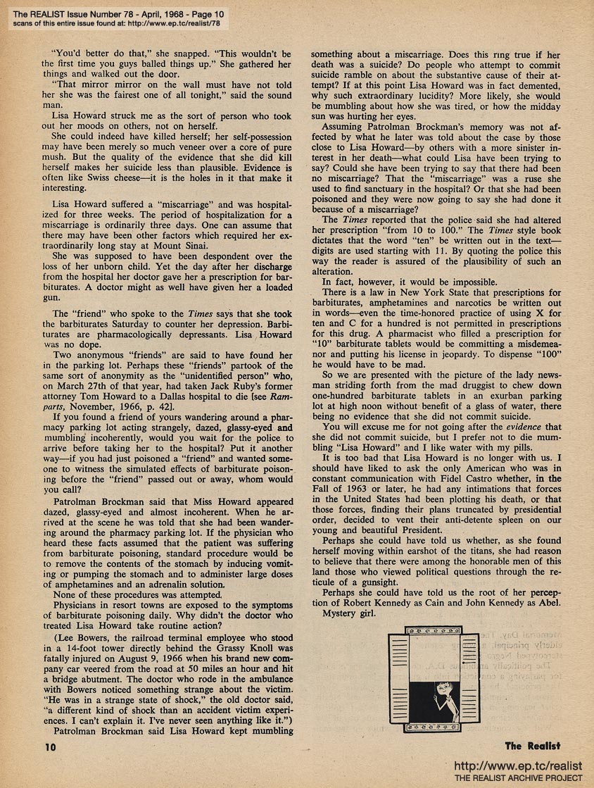 APRIL 1968 CONTENTS: Page 01: FINAL SOLUTIONS TO THE ASSASSINATION QUESTION by Craig Karpel, and by Reginald Dunsany, and by Steve Klinger -- Page 02 -- Page 03 -- Page 04 -- Page 05 -- Page 06 -- Page 07 -- Page 08 -- Page 09: ED FISHER'S PAGE -- Page 10 -- Page 11: A CASE OF ANTI-SEMITISM by Michael Valenti -- Page 12 -- Page 13 -- Page 14: IBM MAKES SURE FREEDOM DOESN'T BECOME LICENSE -- Page 15 -- Back Cover: SOME OF MY BEST FRIENDS ARE NECROPHILIACS by Eric Norden and by Renfreu Neff