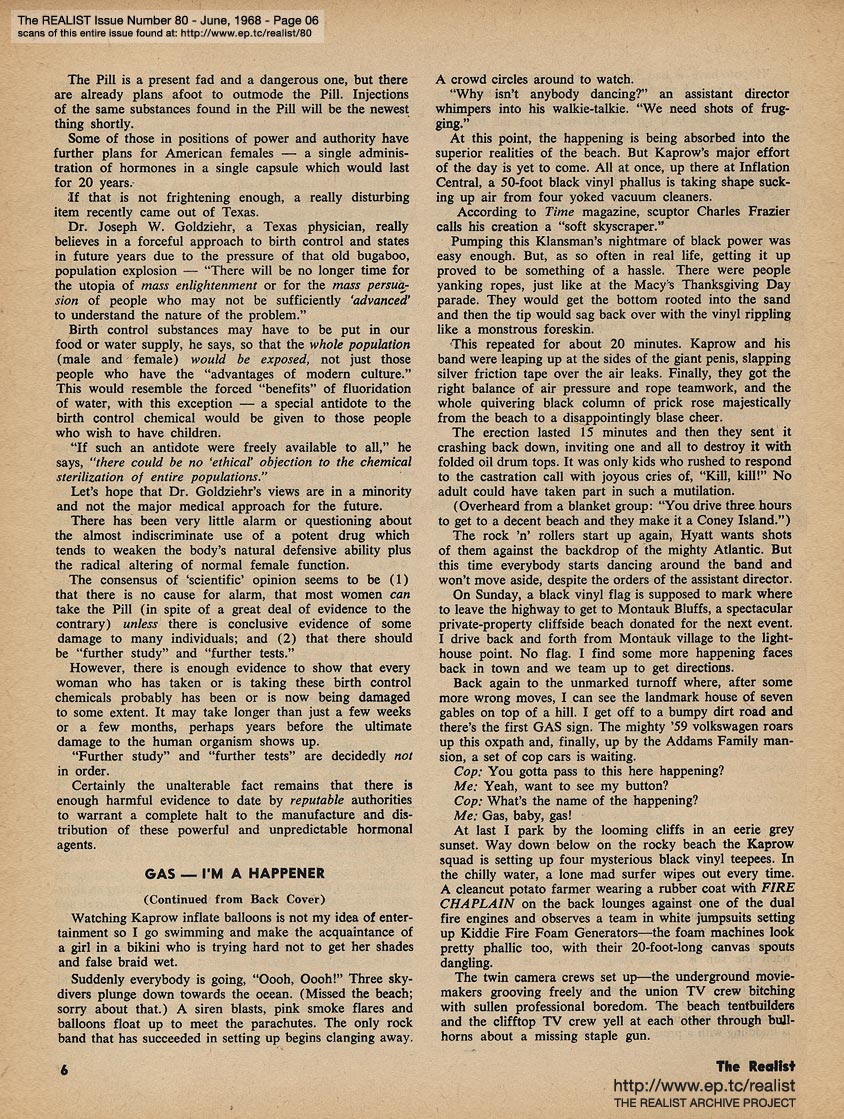 JUNE 1968 CONTENTS: Page 01: FINAL SOLUTIONS TO THE LATRINALIA QUESTION by Donovan Bess, and by Alan Dundes, and by Robert Reisner -- Page 02 -- PERILS OF THE PILL by Jack Soltanoff, D.C. -- Page 03 -- Page 04 -- Page 05 -- Page 06 -- Page 07 -- Page 08 -- Page 09 -- Page 10 -- Page 11 -- Page 12 -- Page 13 -- Page 14: PRACTICAL USES FOR CONDOMS NOW THAT THE PILL HAS RENDERED THEM OBSOLETE by John Francis Putnam -- Page 15: THE RISING YELLOW TIDE by Saul Heller and THE RISING BROWN TIDE by Dan Lund -- Back Cover: GAS - I'M A HAPPENER by Nat Freedland