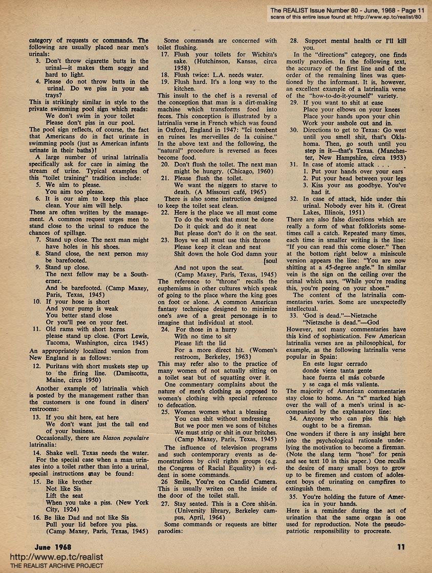 JUNE 1968 CONTENTS: Page 01: FINAL SOLUTIONS TO THE LATRINALIA QUESTION by Donovan Bess, and by Alan Dundes, and by Robert Reisner -- Page 02 -- PERILS OF THE PILL by Jack Soltanoff, D.C. -- Page 03 -- Page 04 -- Page 05 -- Page 06 -- Page 07 -- Page 08 -- Page 09 -- Page 10 -- Page 11 -- Page 12 -- Page 13 -- Page 14: PRACTICAL USES FOR CONDOMS NOW THAT THE PILL HAS RENDERED THEM OBSOLETE by John Francis Putnam -- Page 15: THE RISING YELLOW TIDE by Saul Heller and THE RISING BROWN TIDE by Dan Lund -- Back Cover: GAS - I'M A HAPPENER by Nat Freedland