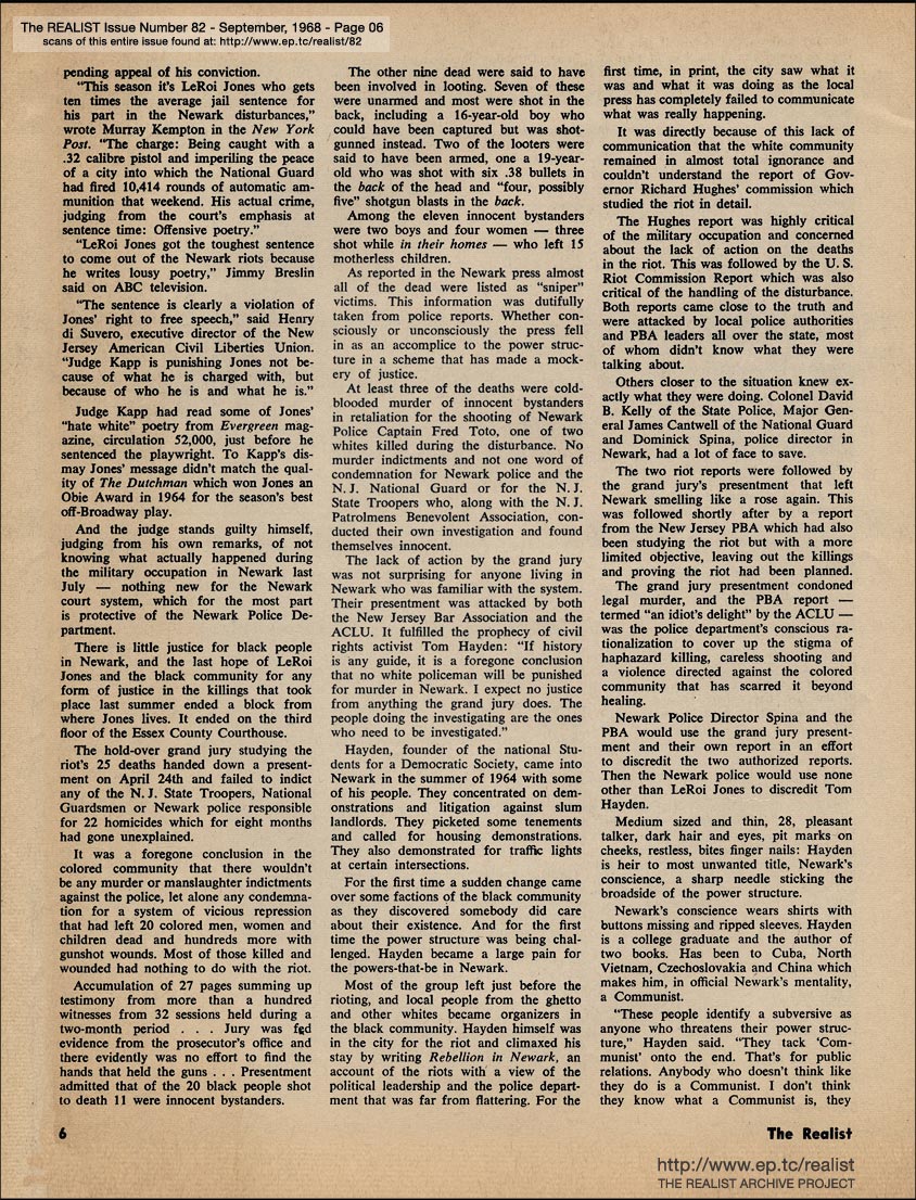 JUNE 1965 CONTENTS: Page 01: THE YIPPIES ARE GOING TO CHICAGO by Jerry Rubin and by Abbie Hoffman -- Page 02: NO, VIRGINIA by Alan Whitney -- Page 03: EDITORIAL GIGGLES -- Page 04: A PROGRESS REPORT FROM THE PARENTS AID SOCIETY -- Page 05: WHAT REALLY HAPPENED WITH LEROI JONES IN NEWARK by Ron Porambo -- Page 06 -- Page 07 -- Page 08 -- Page 09: ED FISHER'S PAGE -- Page 10 -- Page 11: The ROLE OF BROADCASTING DURING CIVIL DISORDER by Kenneth Harwood and by Frank A. Millspaugh, Jr. -- Page 12: ASSASSINATION AWARDS by Ray Puechner -- Page 13: UP WITH VIOLENCE by Rodrigues -- Page 14: SHIRLEY TEMPLE SPEAKS HER MIND -- Page 15: The PROSTHETIC PENIS MEETS THE ARTIFICIAL VAGINA by Paul Krassner and by John Francis Putnam -- Page 16: SOFT-CORE PORNOGRAPHY: PHALLIC SYMBOLISM DEPT. -- Page 17: CO-EXISTING by Saul Heller -- Page 18 -- Page 19: REPORTER AT SMALL by Robert Wolf -- Page 20 -- Page 21 -- Page 22 -- Page 23 -- Back Cover