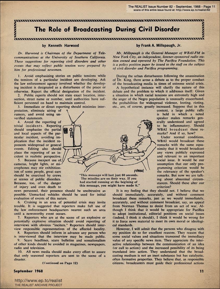 JUNE 1965 CONTENTS: Page 01: THE YIPPIES ARE GOING TO CHICAGO by Jerry Rubin and by Abbie Hoffman -- Page 02: NO, VIRGINIA by Alan Whitney -- Page 03: EDITORIAL GIGGLES -- Page 04: A PROGRESS REPORT FROM THE PARENTS AID SOCIETY -- Page 05: WHAT REALLY HAPPENED WITH LEROI JONES IN NEWARK by Ron Porambo -- Page 06 -- Page 07 -- Page 08 -- Page 09: ED FISHER'S PAGE -- Page 10 -- Page 11: The ROLE OF BROADCASTING DURING CIVIL DISORDER by Kenneth Harwood and by Frank A. Millspaugh, Jr. -- Page 12: ASSASSINATION AWARDS by Ray Puechner -- Page 13: UP WITH VIOLENCE by Rodrigues -- Page 14: SHIRLEY TEMPLE SPEAKS HER MIND -- Page 15: The PROSTHETIC PENIS MEETS THE ARTIFICIAL VAGINA by Paul Krassner and by John Francis Putnam -- Page 16: SOFT-CORE PORNOGRAPHY: PHALLIC SYMBOLISM DEPT. -- Page 17: CO-EXISTING by Saul Heller -- Page 18 -- Page 19: REPORTER AT SMALL by Robert Wolf -- Page 20 -- Page 21 -- Page 22 -- Page 23 -- Back Cover