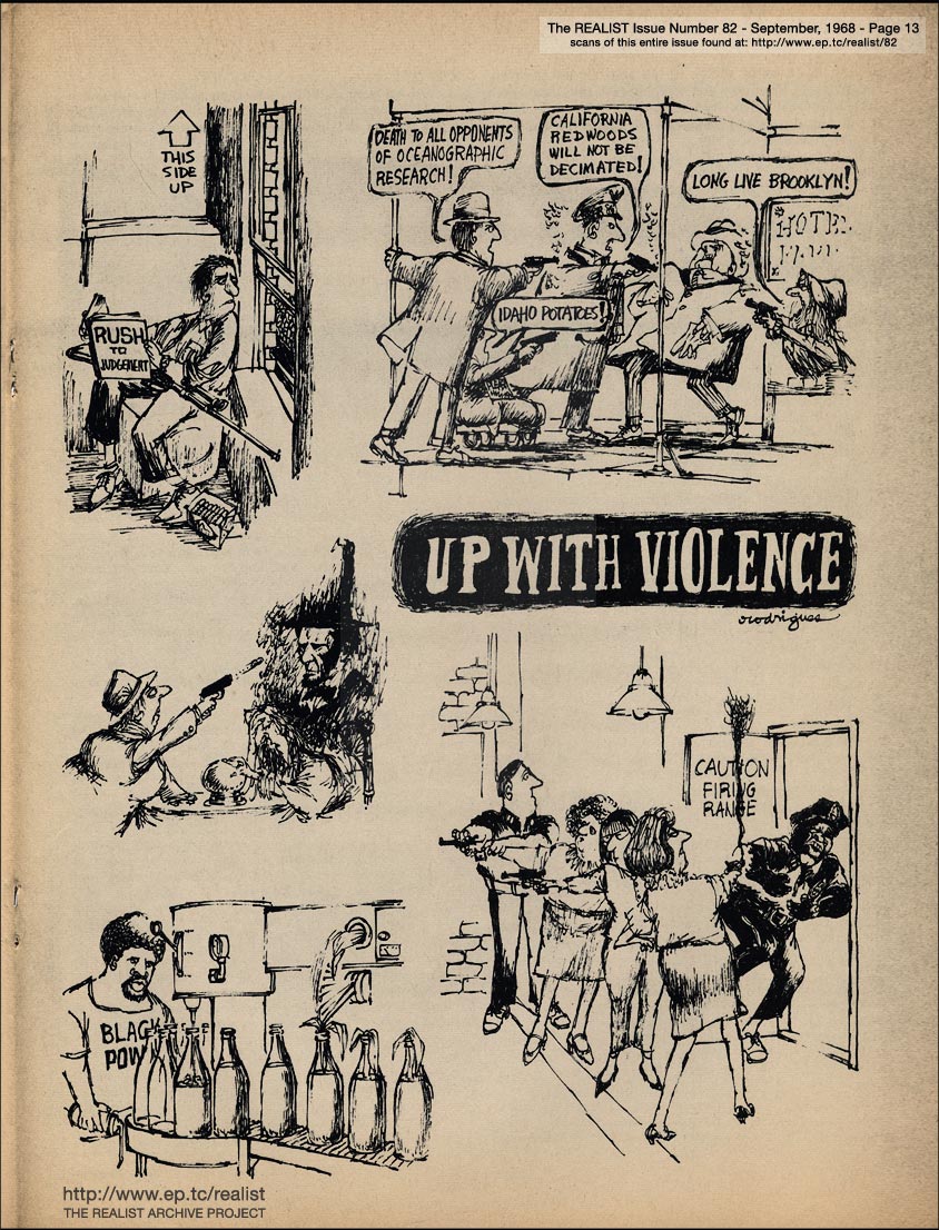 JUNE 1965 CONTENTS: Page 01: THE YIPPIES ARE GOING TO CHICAGO by Jerry Rubin and by Abbie Hoffman -- Page 02: NO, VIRGINIA by Alan Whitney -- Page 03: EDITORIAL GIGGLES -- Page 04: A PROGRESS REPORT FROM THE PARENTS AID SOCIETY -- Page 05: WHAT REALLY HAPPENED WITH LEROI JONES IN NEWARK by Ron Porambo -- Page 06 -- Page 07 -- Page 08 -- Page 09: ED FISHER'S PAGE -- Page 10 -- Page 11: The ROLE OF BROADCASTING DURING CIVIL DISORDER by Kenneth Harwood and by Frank A. Millspaugh, Jr. -- Page 12: ASSASSINATION AWARDS by Ray Puechner -- Page 13: UP WITH VIOLENCE by Rodrigues -- Page 14: SHIRLEY TEMPLE SPEAKS HER MIND -- Page 15: The PROSTHETIC PENIS MEETS THE ARTIFICIAL VAGINA by Paul Krassner and by John Francis Putnam -- Page 16: SOFT-CORE PORNOGRAPHY: PHALLIC SYMBOLISM DEPT. -- Page 17: CO-EXISTING by Saul Heller -- Page 18 -- Page 19: REPORTER AT SMALL by Robert Wolf -- Page 20 -- Page 21 -- Page 22 -- Page 23 -- Back Cover