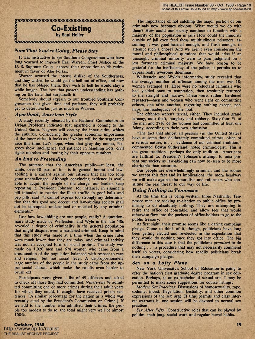 OCTOBER 1968 CONTENTS: Page 01: POPE PAUL PRICKS PROPHYLACTICS -- Page 02: NO, VIRGINIA by Alan Whitney -- Page 03: EDITORIAL GIGGIES -- Page 04: INTERRACIAL MARRIAGE by rodrigues -- Page 05: MAILER, McLUHAN AND MUGGERIDGE: ON OBSCENITY -- Page 06 -- Page 07 -- Page 08 -- Page 09 -- Page 10 -- Page 11 -- Page 12 -- Page 13: ED FISHER'S PAGE -- Page 14: WHAT ARE WE GOING TO DO ABOUT PORNOGRAPHY by Paul Hoffman and by Don Baumgart -- Page 15 -- Page 16: A PAIR BY PUECHNER (two pieces by Ray Puechner) -- Page 17: Two cartoons by Mort Gerberg -- Page 18: A HARD DAY'S NIGHT -- Page 19: CO-EXISTING by Saul Heller -- Page 20 -- Page 21: REPORTER AT SMALL by Robert Wolf -- Page 22 -- Page 23: IF YOU TURN ON DON'T DRIVE by Mort Gerberg -- Back Cover: THE POLICE BRUTALITY MANUAL by John Francis Putnam
