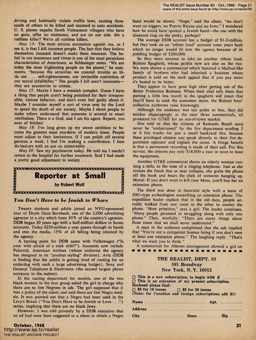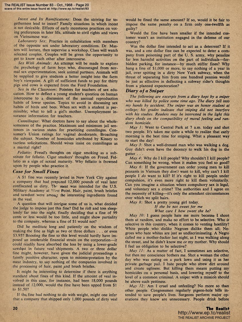 OCTOBER 1968 CONTENTS: Page 01: POPE PAUL PRICKS PROPHYLACTICS -- Page 02: NO, VIRGINIA by Alan Whitney -- Page 03: EDITORIAL GIGGIES -- Page 04: INTERRACIAL MARRIAGE by rodrigues -- Page 05: MAILER, McLUHAN AND MUGGERIDGE: ON OBSCENITY -- Page 06 -- Page 07 -- Page 08 -- Page 09 -- Page 10 -- Page 11 -- Page 12 -- Page 13: ED FISHER'S PAGE -- Page 14: WHAT ARE WE GOING TO DO ABOUT PORNOGRAPHY by Paul Hoffman and by Don Baumgart -- Page 15 -- Page 16: A PAIR BY PUECHNER (two pieces by Ray Puechner) -- Page 17: Two cartoons by Mort Gerberg -- Page 18: A HARD DAY'S NIGHT -- Page 19: CO-EXISTING by Saul Heller -- Page 20 -- Page 21: REPORTER AT SMALL by Robert Wolf -- Page 22 -- Page 23: IF YOU TURN ON DON'T DRIVE by Mort Gerberg -- Back Cover: THE POLICE BRUTALITY MANUAL by John Francis Putnam