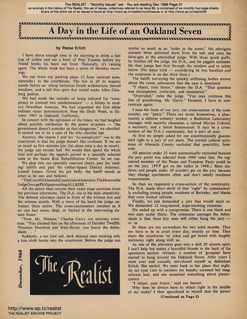 An anomaly in the history of The Realist, this assortment of issues, collectively referred to as "Issue No. 85" is comprised of six monthly four page sheets. This abbreviated output from December 1968 through June 1969 is an indication of the unique turbulence of that time, particularly for activists and artists -- many of whom were prominent Realist contributors. This set of issues closely follows the September DNC riots in Chicago (see "The Yippies Are Going to Chicago", issue 82) and begins one month after Nixon's win for the U.S. presidency. For a further tenor of this confrontational era, see "The Trial of Abbie Hoffman's Shirt" in issue 84. See also the lead story here, "A Day in the Life of an Oakland Seven" by Oakland 7 conspiracy trial member Reese Erlich.