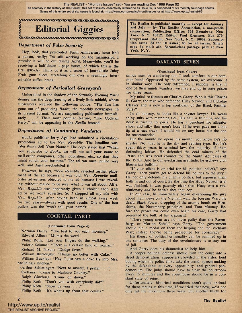 DECEMBER 1968 CONTENTS: Page 01: A DAY IN THE LIFE OF AN OAKLAND SEVEN by Reese Erlich -- Page 02: EDITORIAL GIGGIES -- Page 03: DEATH OF AN ASTRONAUT by Edmund C. Levin -- Back Page: The COCKTAIL PARTY (part one) by Jerome Agel -- FEBRUARY 1969 CONTENTS: Page 01: MORE FINAL SOLUTIONS TO THE JEWISH QUESTION by Name Withheld and ANTI-SEMITISM (dedicated to Albert Shanker) -- Page 02 -- Page 03: OIL DRUM BEATING FOR FUN AND PROFIT and WHOSE LITTLE GENOCIDE ARE YOU? -- Back Page: REPORTER AT SMALL by Robert Wolf -- MARCH 1969 CONTENTS: Page 01: THE LAST LETTERS OF CHÉ GUEVARA by Abbie Hoffman - Jerry Rubin - Paul Krassner - Ed Sanders -- Page 02 -- Page 03 -- Back Page: NO, VIRGINIA by Alan Whitney -- APRIL 1969 CONTENTS: Page 01: IS MALNUTRITION A MAJOR CAUSE OF MENTAL ILLNESS? by Jack Soltanoff -- Page 02 -- Page 03: A Jewish Joke? -- Back Page: The COCKTAIL PARTY (part two) by Jerome Agel -- MAY 1969 CONTENTS: -- Page 01: MISADVENTURES IN SPACE AND TIME by Eric Norden -- Page 02 -- Page 03: SUBCULTURAL EXCHANGE by Paul Sibley -- Back Page: TRUTH IS BUSTIN' OUT ALL OVER by Robert Lasson -- JUNE 1969 CONTENTS: Page 01: CO-EXISTING WITH LITTER AND OTHER PLEASURES by Saul Heller -- Page 02 -- Page 03 -- Last Page: CONFESSIONS OF A SWINGER as told to John Wilcock
