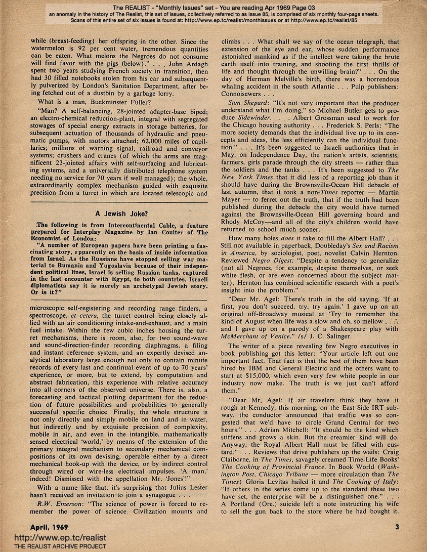 03: A Jewish Joke? -- Back Page: The COCKTAIL PARTY (part two) by Jerome Agel -- MAY 1969 CONTENTS: -- Page 01: MISADVENTURES IN SPACE AND TIME by Eric Norden -- Page 02 -- Page 03: SUBCULTURAL EXCHANGE by Paul Sibley -- Back Page: TRUTH IS BUSTIN' OUT ALL OVER by Robert Lasson -- JUNE 1969 CONTENTS: Page 01: CO-EXISTING WITH LITTER AND OTHER PLEASURES by Saul Heller -- Page 02 -- Page 03 -- Last Page: CONFESSIONS OF A SWINGER as told to John Wilcock