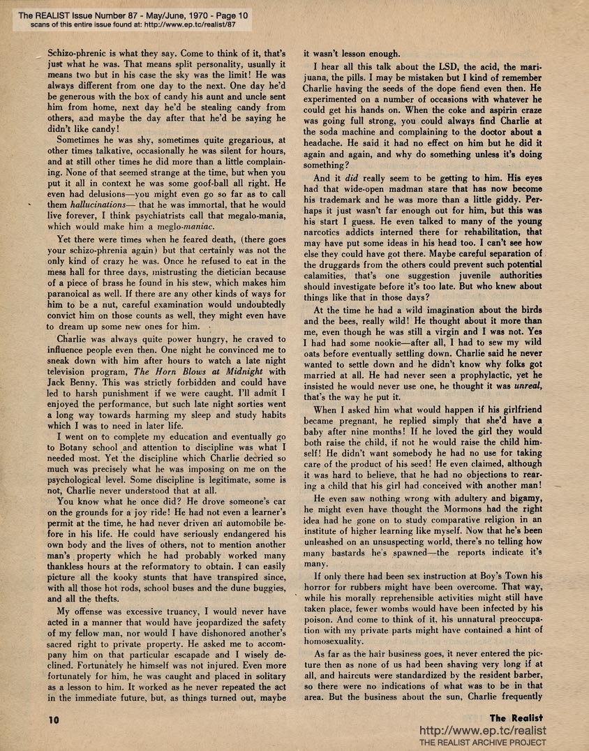 MAY-JUNE 1970 CONTENTS: Page 01: BEHIND THE GAY LIBERATION FRONT by Edward Sagarin and CHARLES MANSON WAS MY BUNKMATE by Richard Meltzer -- Page 02: Why "The Up Your Tenth Anniversary Issue of The Realist Editorial Giggy Trip" Will Be Two Years Late -- Page 03: THE PAUSE THAT HOOKS by Louis Rapoport -- Page 04 -- Page 05: CO-EXISTING by Saul Heller -- Page 06 -- Page 07: POST & GAURDIAN MERGE by Victor Richman -- Page 08 -- Page 09 -- Page 10 -- Page 11 -- Page 12: AUNT PUSSYCAT'S CABIN by Claudia Dreifus -- Page 13: MISS LULU MOPPET by Jay Lynch -- Page 14 -- Page 15: NO, VIRGINIA by Alan Whitney -- Page 16 -- Page 17 -- Page 18 -- Page 19 -- Page 20 -- Page 21 -- Page 22 -- Page 23 -- Back Cover: "IF THERE IS AN ATOMIC ATTACK AND YOU SURVIVE, AS A POSTAL EMPLOYEE YOU ARE DIRECTED TO REPORT TO THE NEAREST POSTAL INSTALLATION FOR CIVIL DEFENSE OR POSTAL WORK" by Dick Guindon