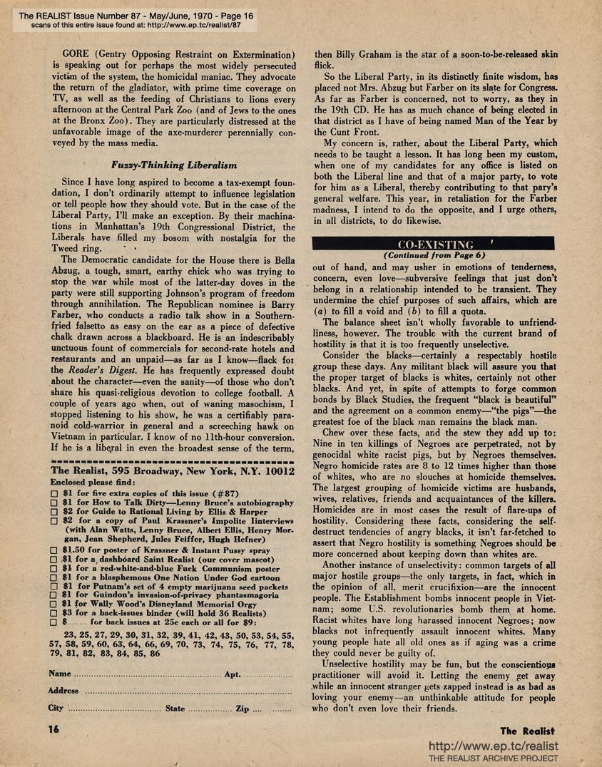 MAY-JUNE 1970 CONTENTS: Page 01: BEHIND THE GAY LIBERATION FRONT by Edward Sagarin and CHARLES MANSON WAS MY BUNKMATE by Richard Meltzer -- Page 02: Why "The Up Your Tenth Anniversary Issue of The Realist Editorial Giggy Trip" Will Be Two Years Late -- Page 03: THE PAUSE THAT HOOKS by Louis Rapoport -- Page 04 -- Page 05: CO-EXISTING by Saul Heller -- Page 06 -- Page 07: POST & GAURDIAN MERGE by Victor Richman -- Page 08 -- Page 09 -- Page 10 -- Page 11 -- Page 12: AUNT PUSSYCAT'S CABIN by Claudia Dreifus -- Page 13: MISS LULU MOPPET by Jay Lynch -- Page 14 -- Page 15: NO, VIRGINIA by Alan Whitney -- Page 16 -- Page 17 -- Page 18 -- Page 19 -- Page 20 -- Page 21 -- Page 22 -- Page 23 -- Back Cover: "IF THERE IS AN ATOMIC ATTACK AND YOU SURVIVE, AS A POSTAL EMPLOYEE YOU ARE DIRECTED TO REPORT TO THE NEAREST POSTAL INSTALLATION FOR CIVIL DEFENSE OR POSTAL WORK" by Dick Guindon