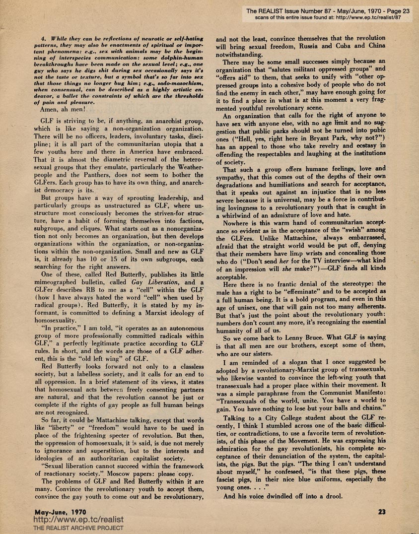 MAY-JUNE 1970 CONTENTS: Page 01: BEHIND THE GAY LIBERATION FRONT by Edward Sagarin and CHARLES MANSON WAS MY BUNKMATE by Richard Meltzer -- Page 02: Why "The Up Your Tenth Anniversary Issue of The Realist Editorial Giggy Trip" Will Be Two Years Late -- Page 03: THE PAUSE THAT HOOKS by Louis Rapoport -- Page 04 -- Page 05: CO-EXISTING by Saul Heller -- Page 06 -- Page 07: POST & GAURDIAN MERGE by Victor Richman -- Page 08 -- Page 09 -- Page 10 -- Page 11 -- Page 12: AUNT PUSSYCAT'S CABIN by Claudia Dreifus -- Page 13: MISS LULU MOPPET by Jay Lynch -- Page 14 -- Page 15: NO, VIRGINIA by Alan Whitney -- Page 16 -- Page 17 -- Page 18 -- Page 19 -- Page 20 -- Page 21 -- Page 22 -- Page 23 -- Back Cover: "IF THERE IS AN ATOMIC ATTACK AND YOU SURVIVE, AS A POSTAL EMPLOYEE YOU ARE DIRECTED TO REPORT TO THE NEAREST POSTAL INSTALLATION FOR CIVIL DEFENSE OR POSTAL WORK" by Dick Guindon